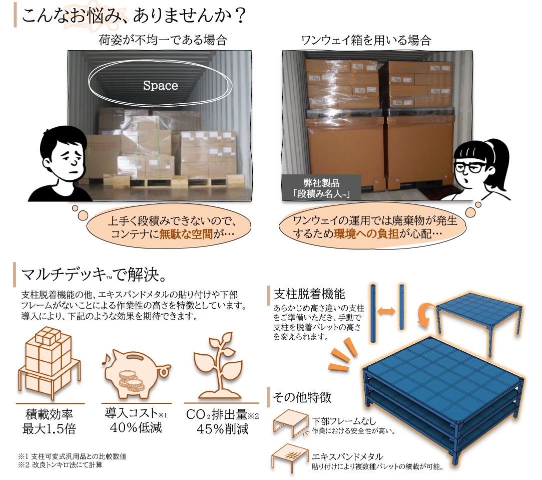 治具を用いず異形状貨物を輸送する際、コンテナの上部に無駄な空間が生じてしまいます。 そこで、マルチデッキ™を導入することにより、空間を無駄なく活用できるだけでなく、梱包強度が弱い貨物でも安心して輸送できます。