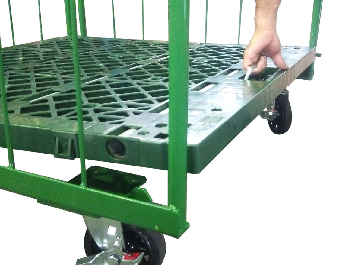 かご台車を折りたたむ時に、底板を跳ね上げたら、必ず底板をストッパーでロックしてください。