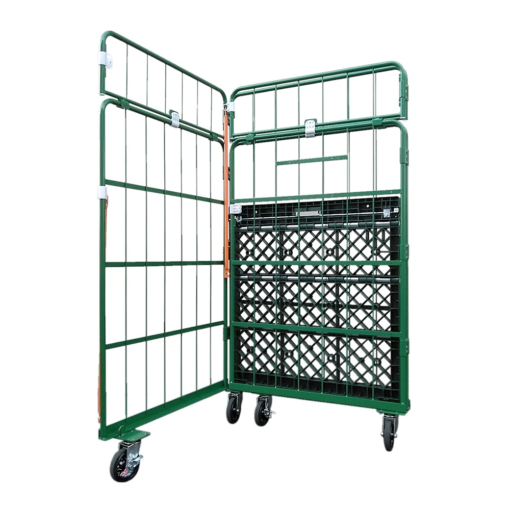 新品カゴ台車 連結鉄タイプ(バー2本) 底板樹脂 W1100×D1100×H2000mm (グリーン)
